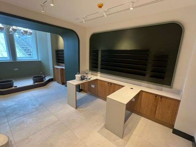 Bespoke laminate vanity / dresser units with oak framed trolleys, storage wall with feature panelling, manicure desks and hair stations were fitted along with bronze effect metal shelving and solid surface Silestone tops.